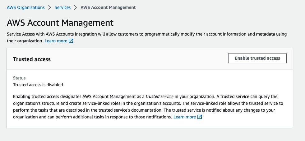 Don’t forget to enable this Account Management into your root aws account, go to organization »» services »» select Account Management then click to enable. like this image: