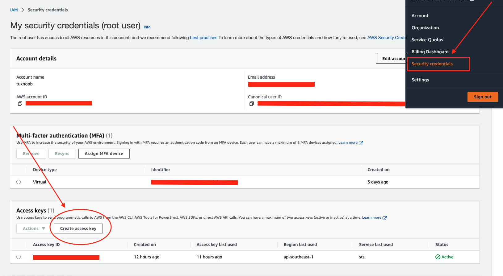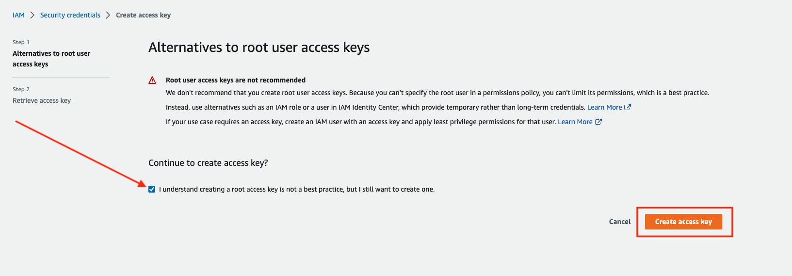 For your info, the step to enable or create AccessKey and SecretKay in AWS root account is not recommended and high risk. So, this is only temporary, after which it will be deleted again.