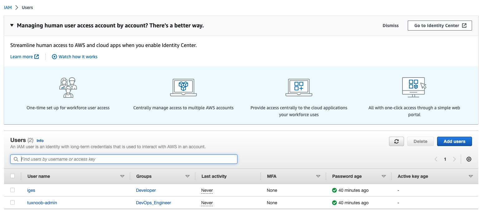 IAM users function is for limit in AWS Resources, like read only resource from other division or except for infra. so other users cannot create the resource, because the user have a limitation or policy. In this tutorial will create several users, group and custom policy for manage / maintain the IAM.