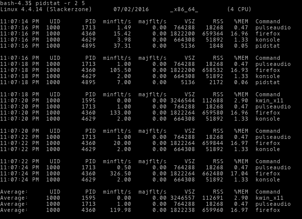 The simple command for running pidstat, just type pidstat command in terminal (Gnome) or konsole (KDE).